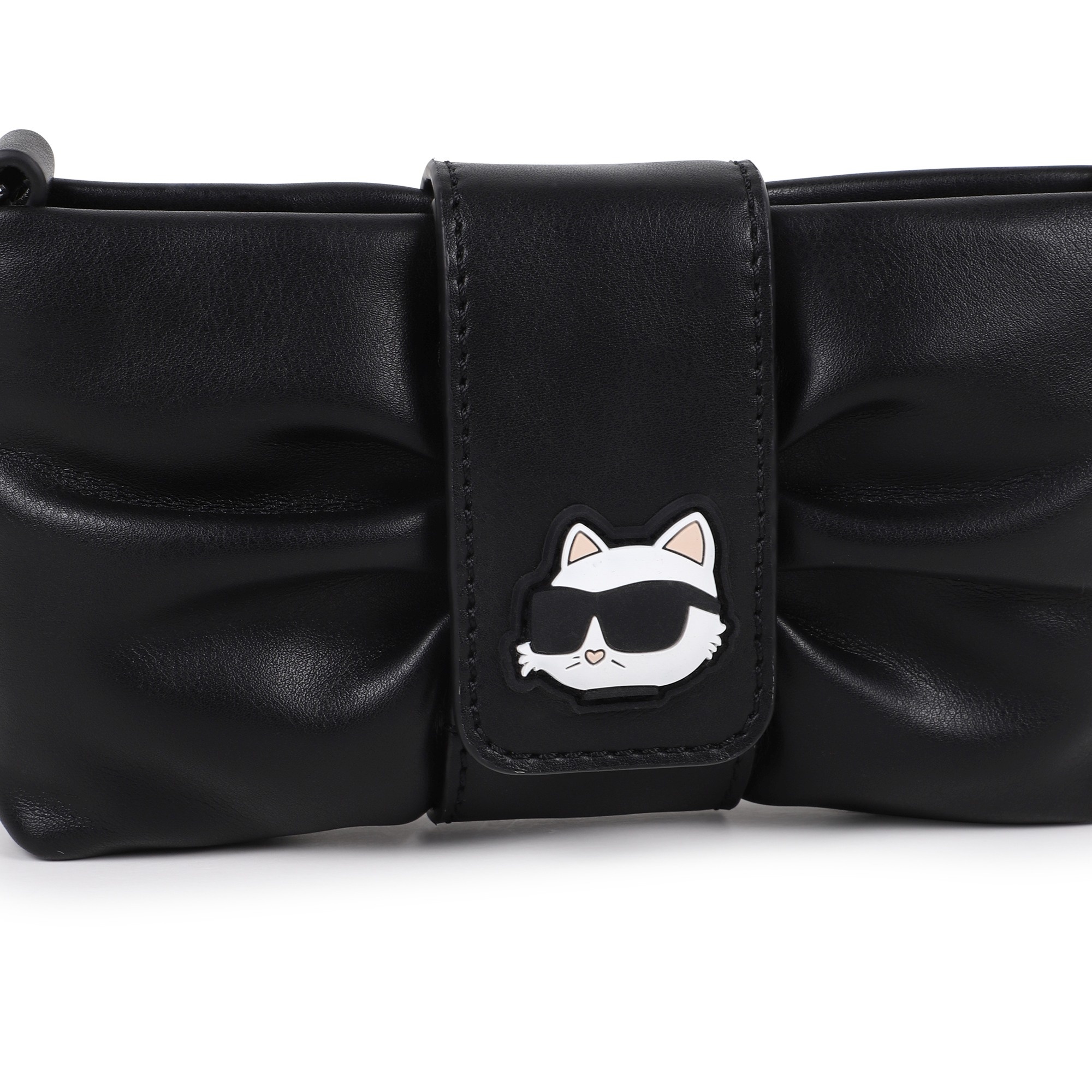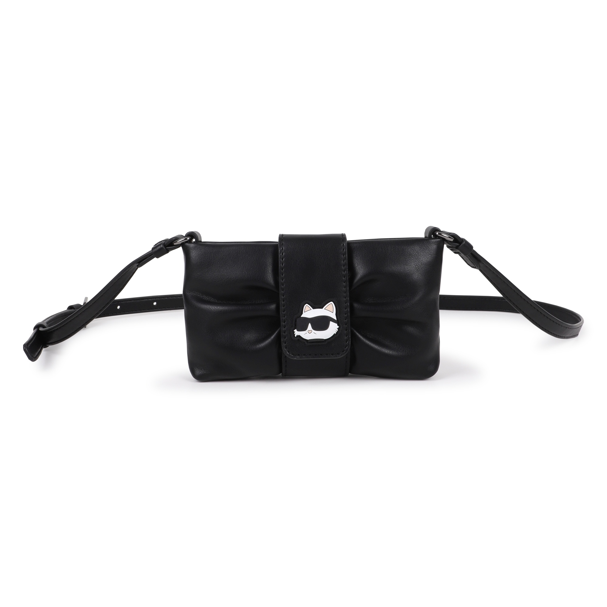 • Mini black fashion bag with a magnetic snap closure featuring the classic kitten.