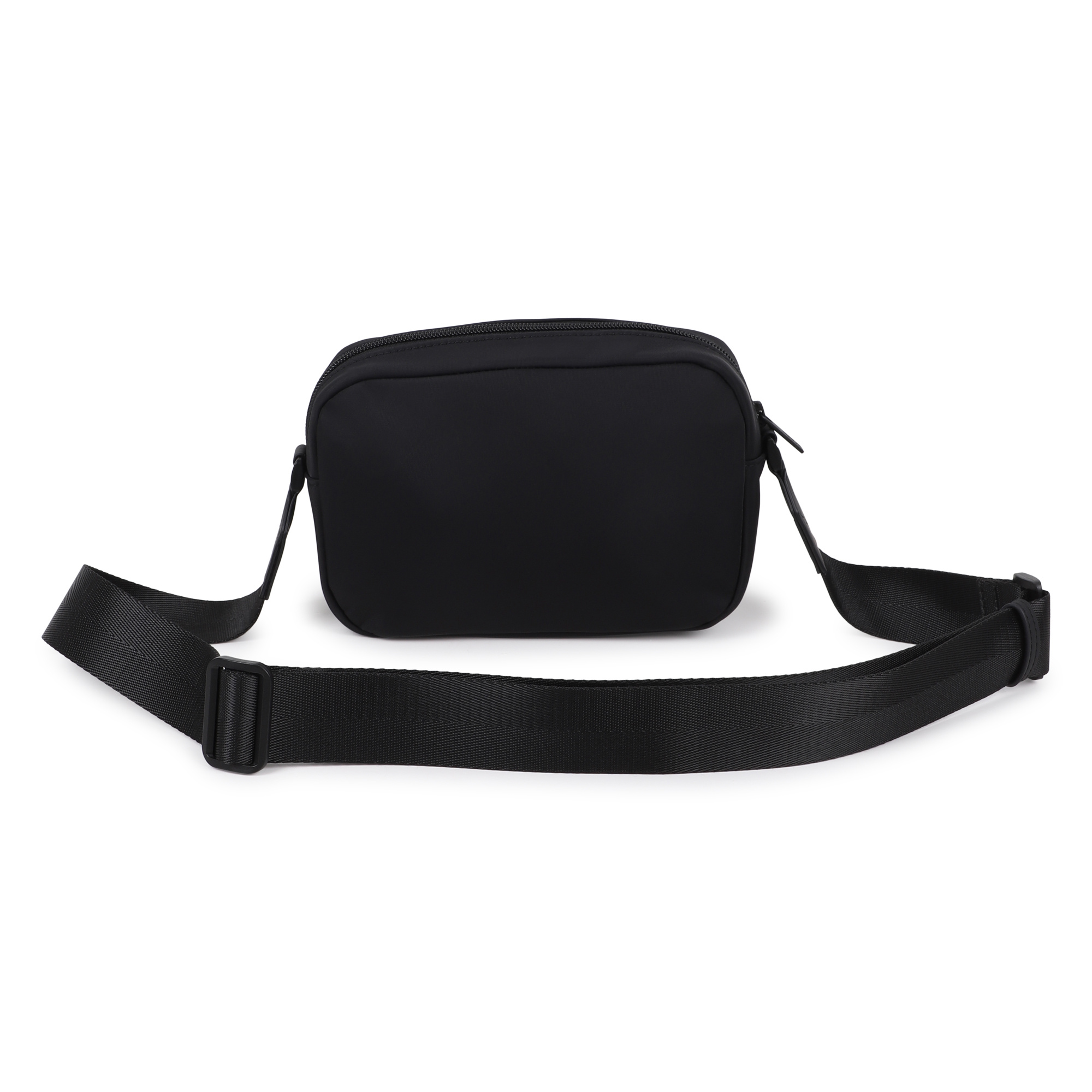 • Black fashion bag with white lettering on the front. Zip closure and shoulder strap.
