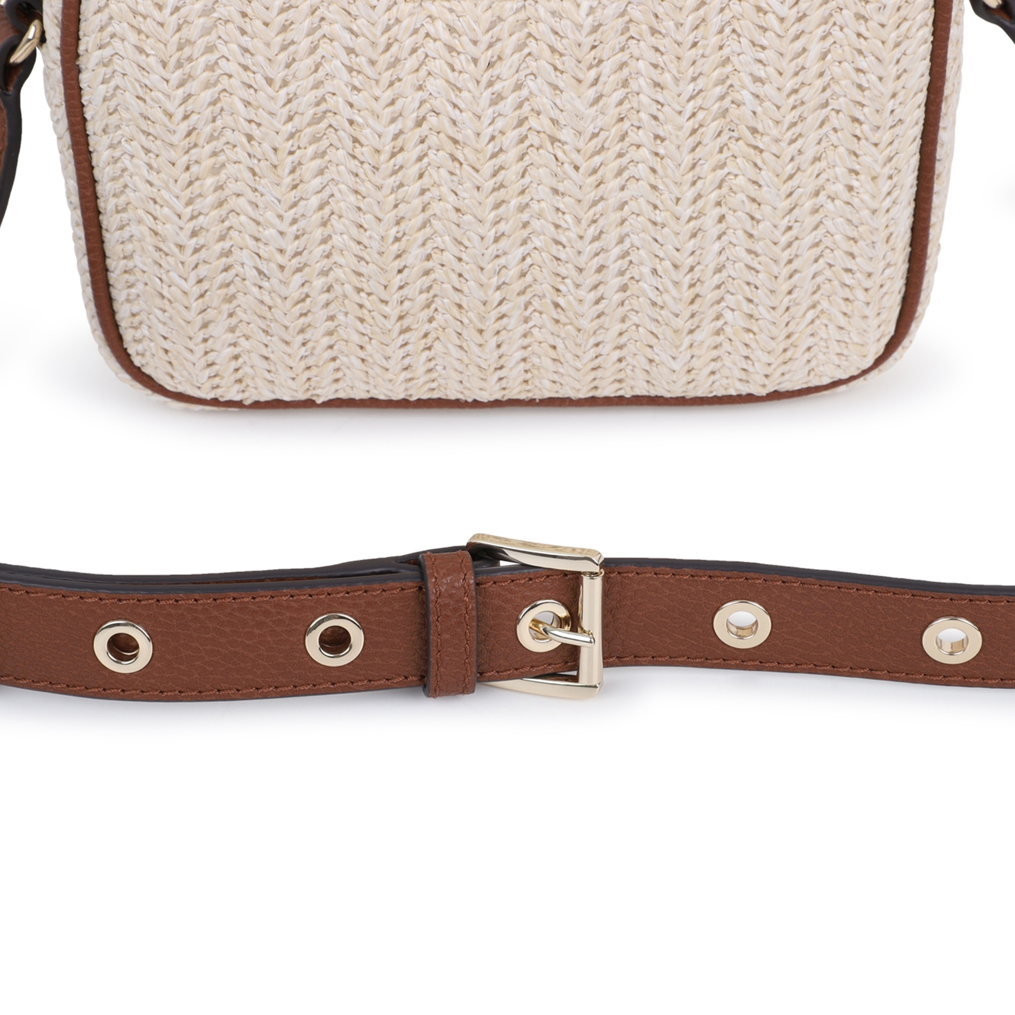 • Straw-style handbag with a brown leather shoulder strap.