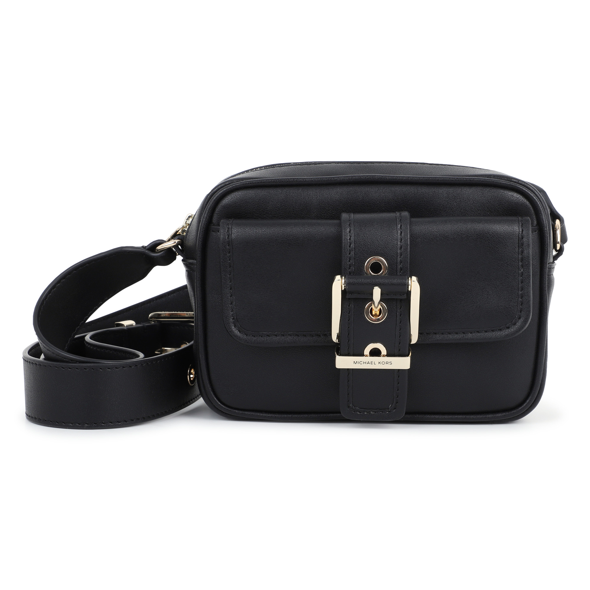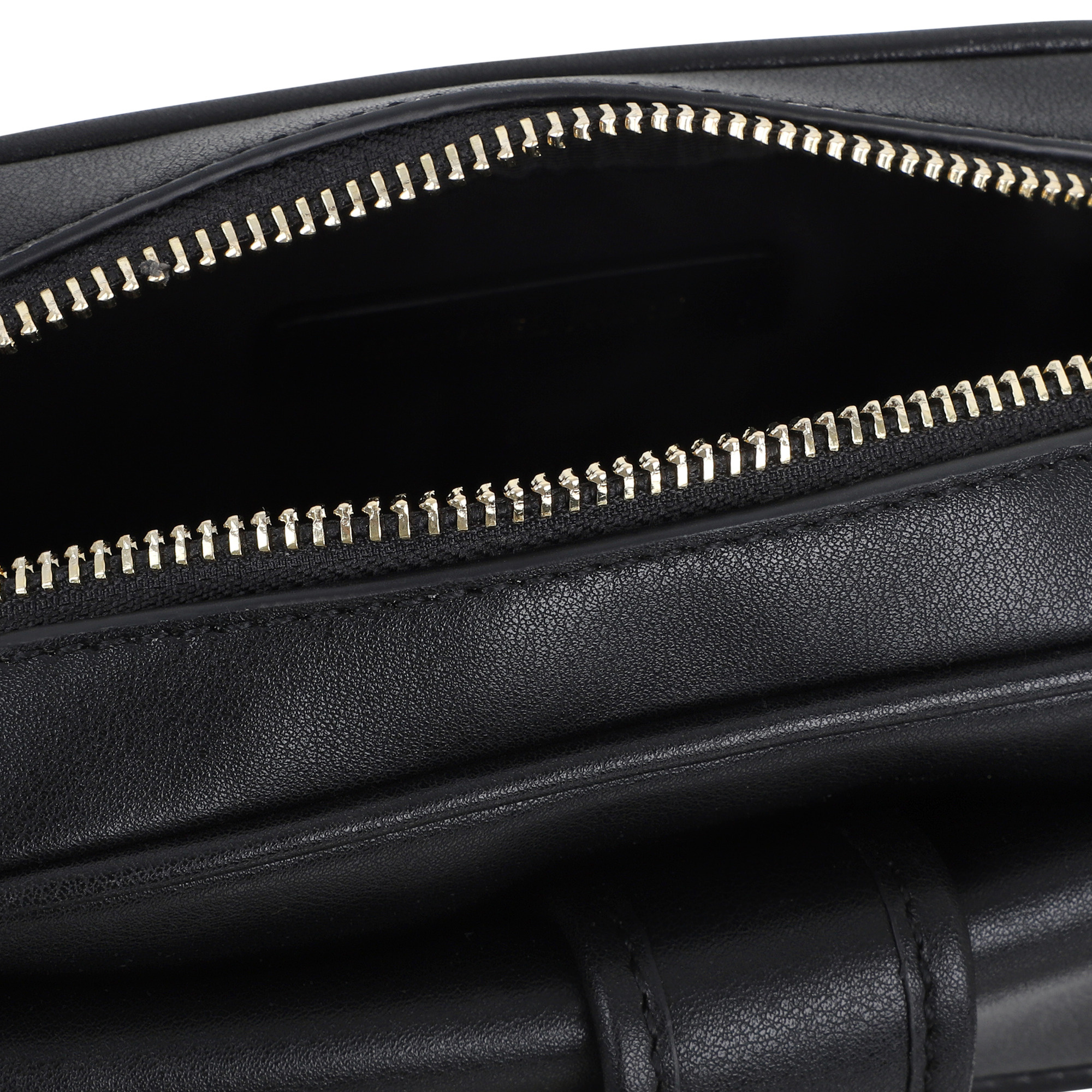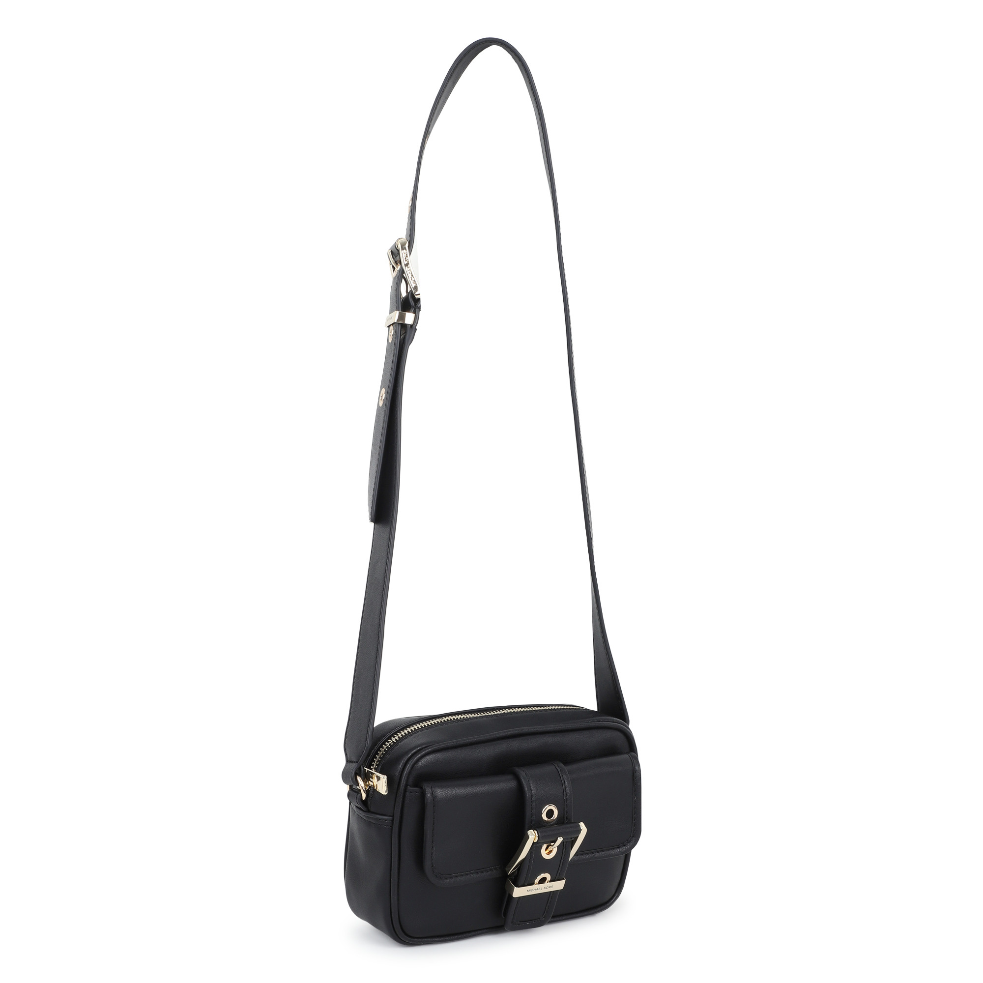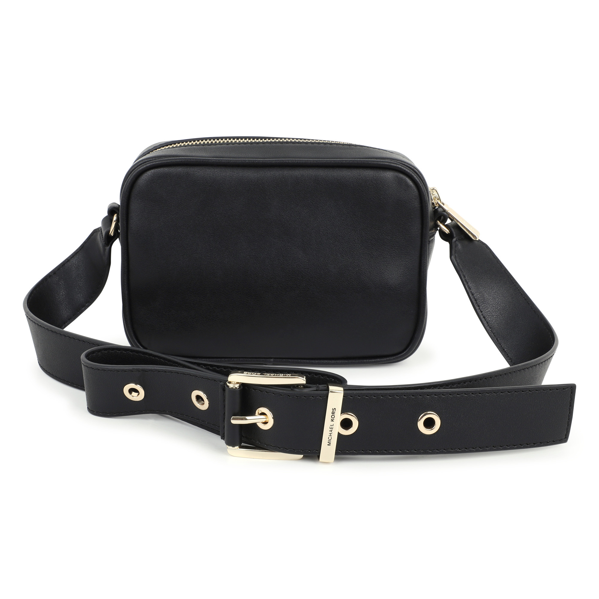• Black leather-style handbag with zip closure and gold belt.