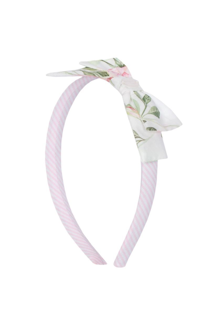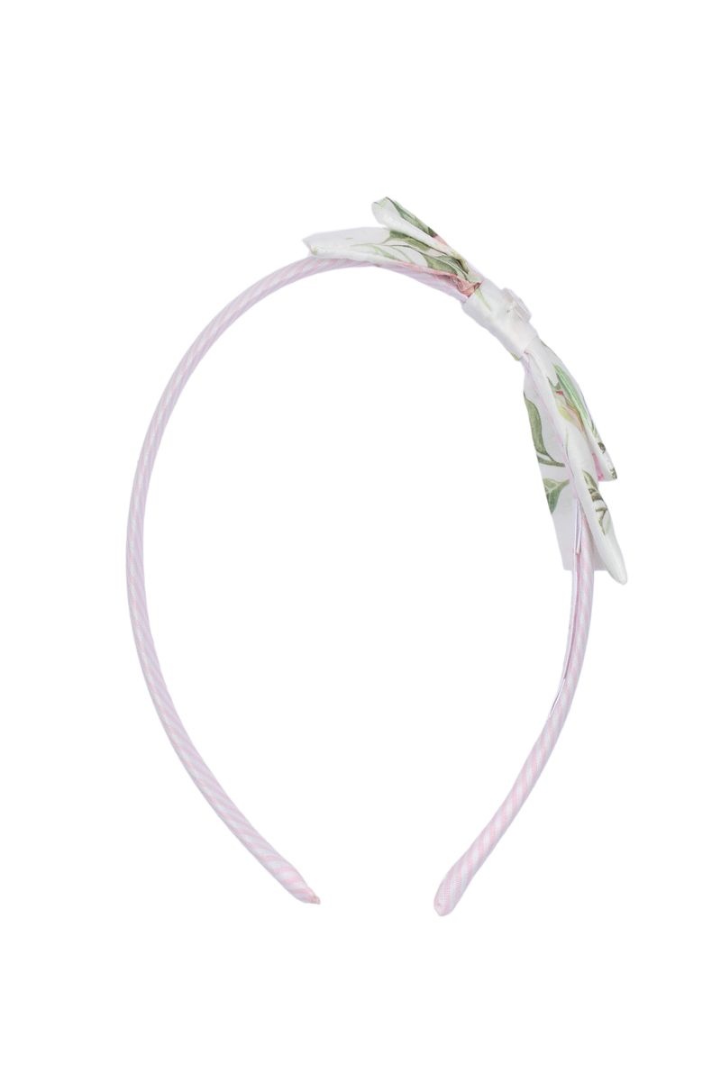 • White and pink striped headband with decorative floral bow.