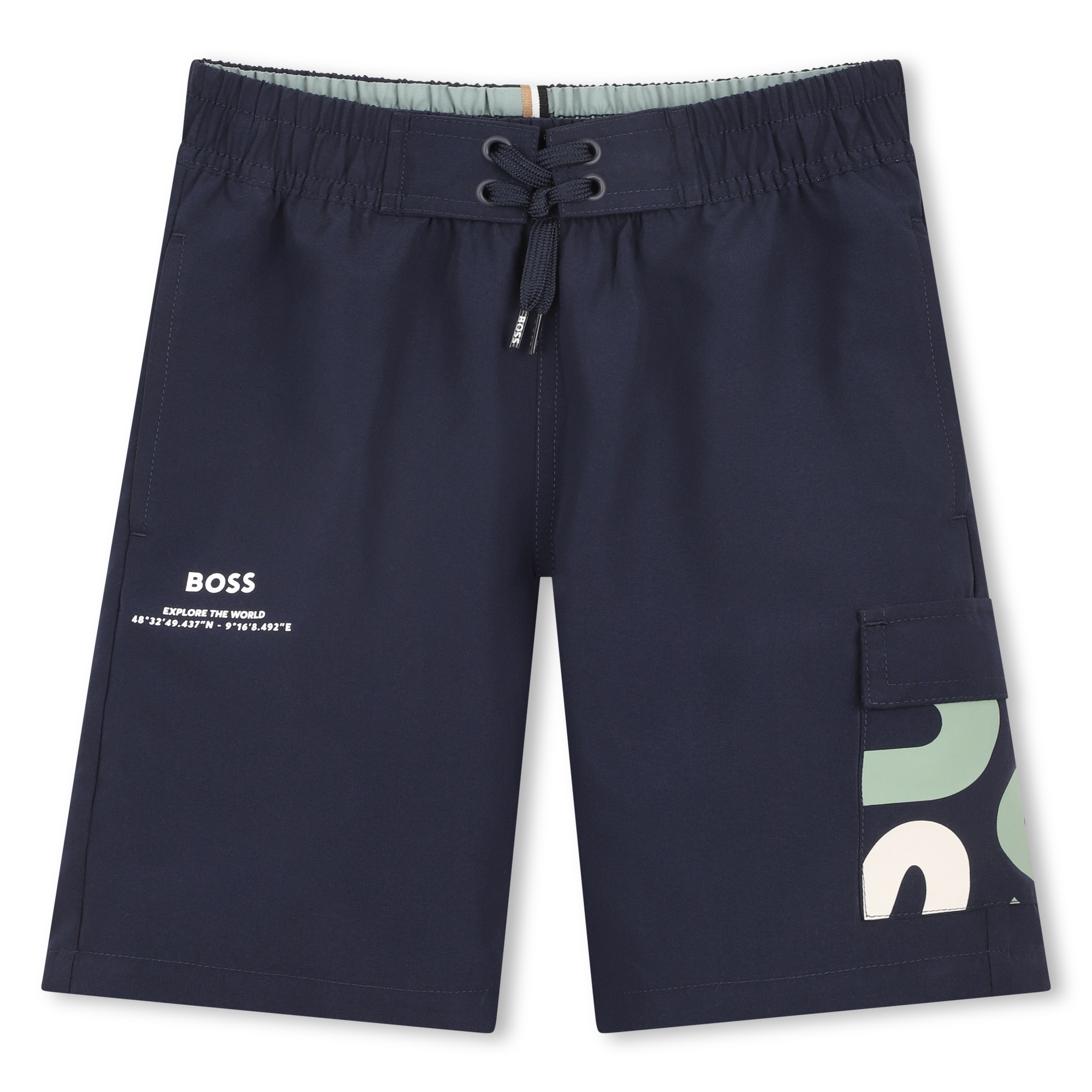 • Navy blue shorts with a green and white print. Elasticated waistband with drawstrings.