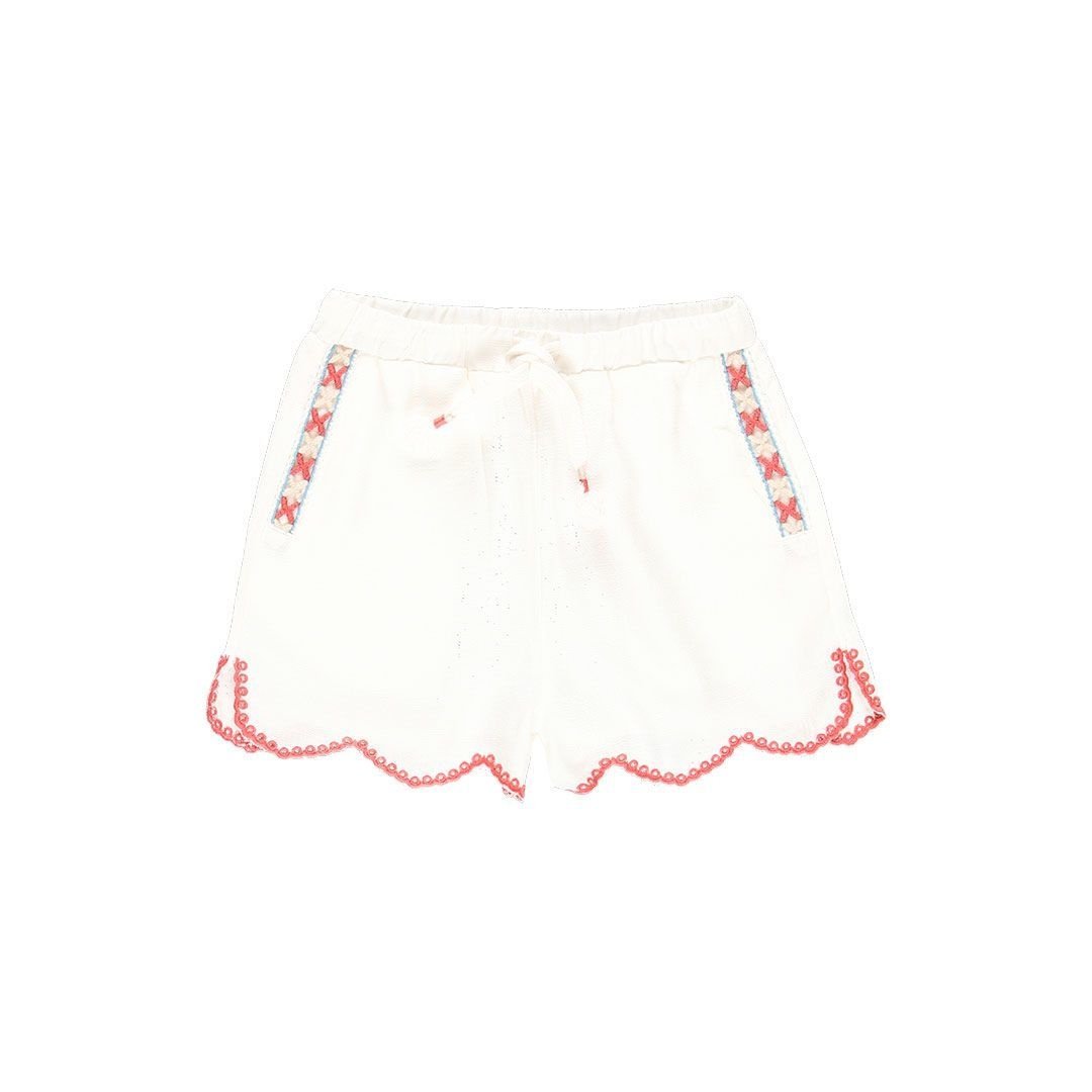 • White shorts with elasticated waistband.