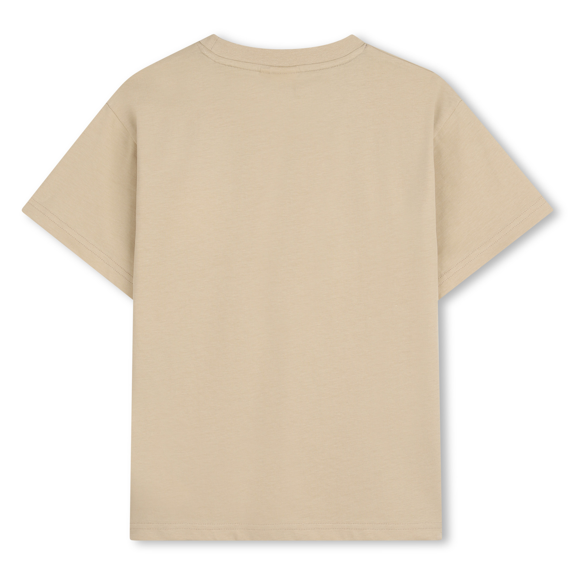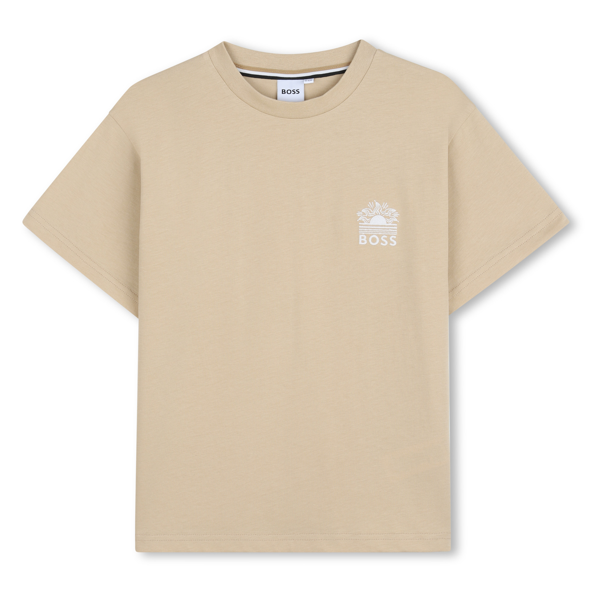• Beige T-shirt with white woven logo on the front.