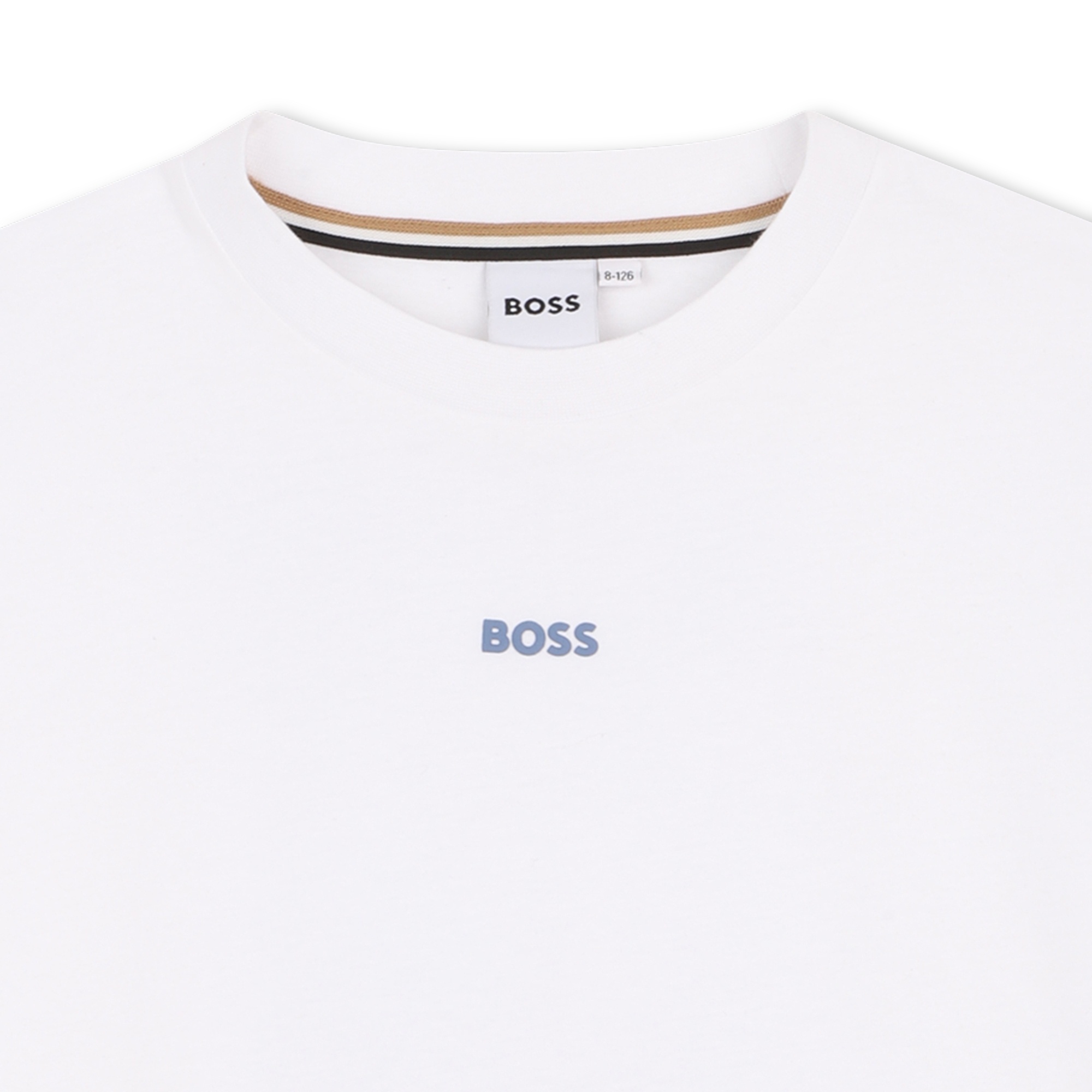 • White T-shirt with a blue logo on the front and a brown and blue gradient print on the back.