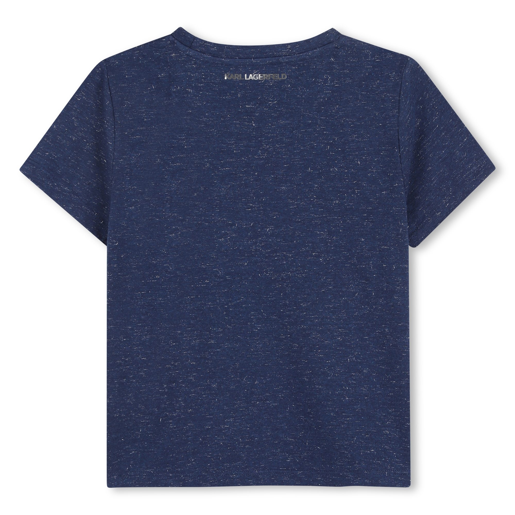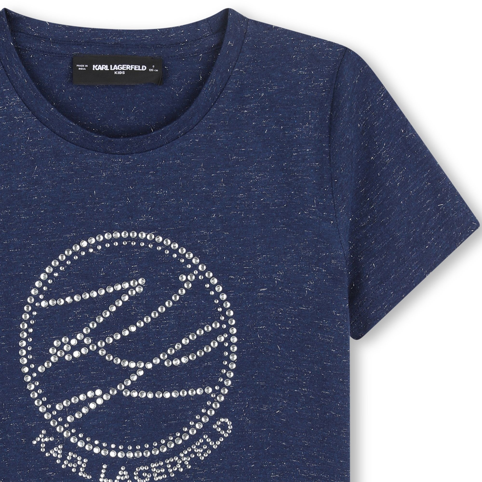 • Shiny navy blue T-shirt with a small silver diamond logo.