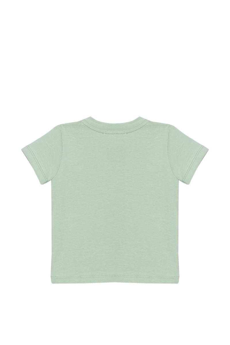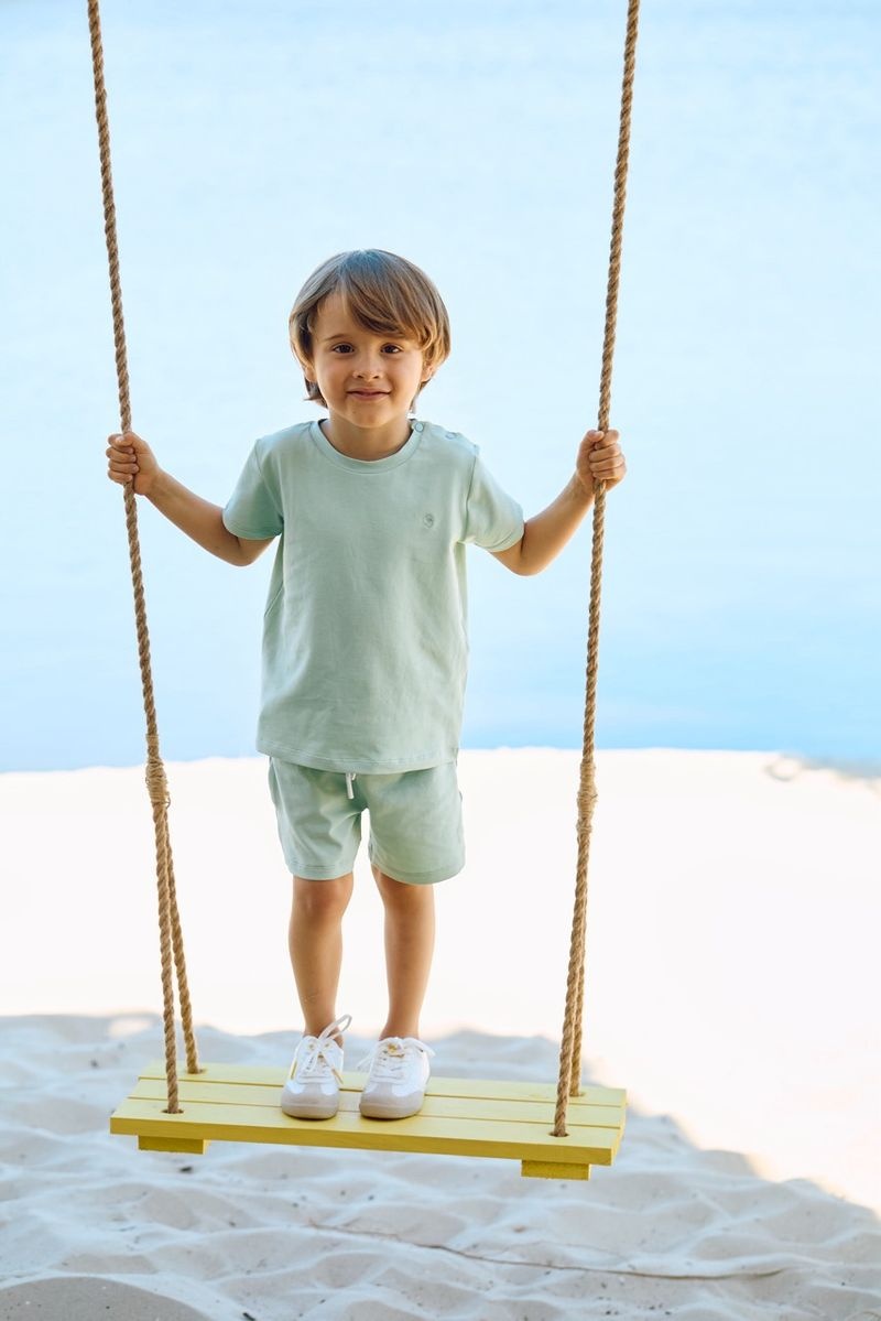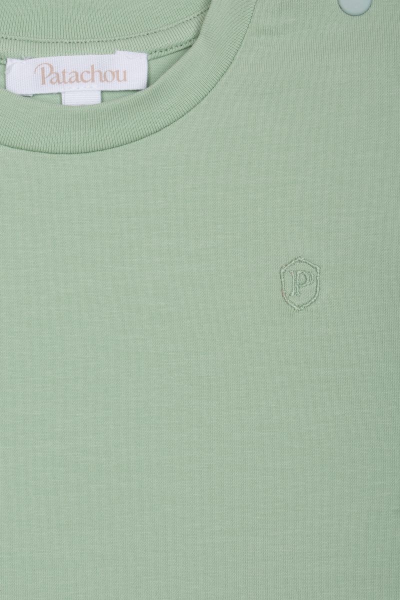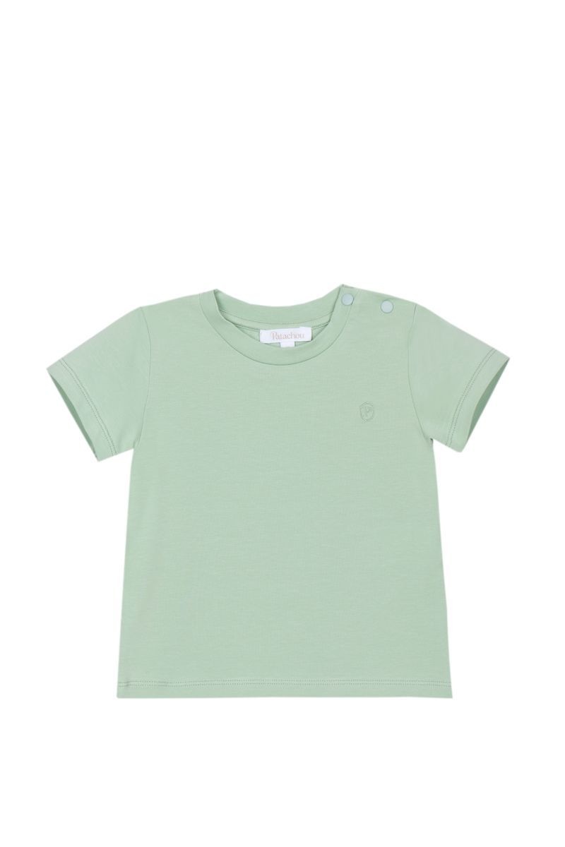 • Short-sleeved sage-colored top with snap buttons at the shoulder.