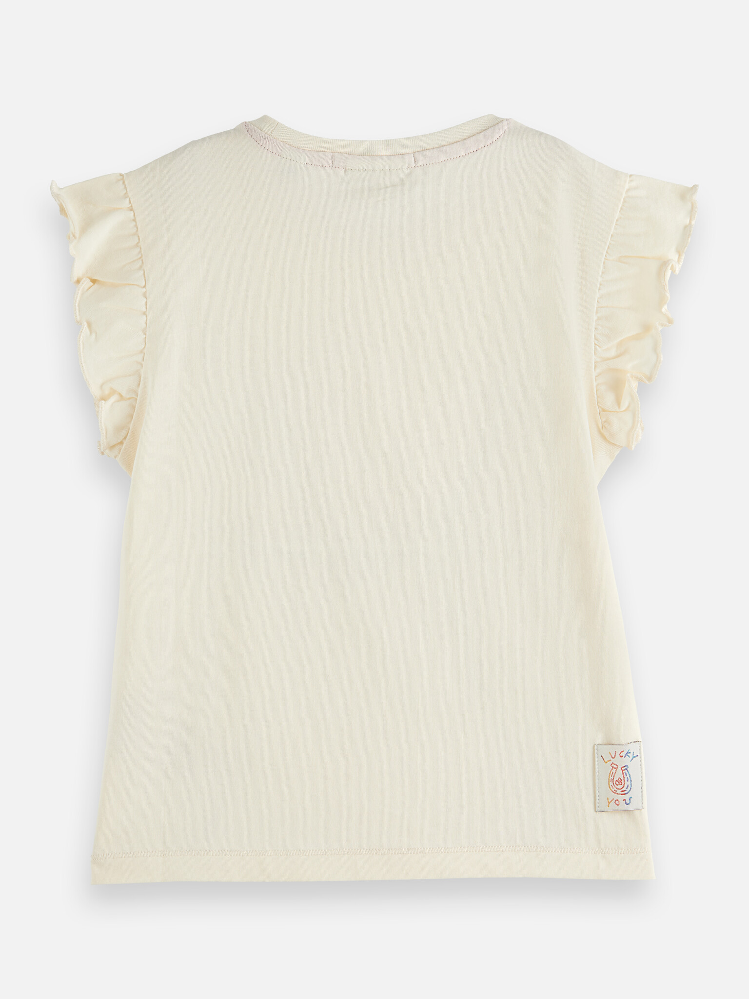 • Cream-colored flutter-sleeve T-Shirt with a print on the front.
