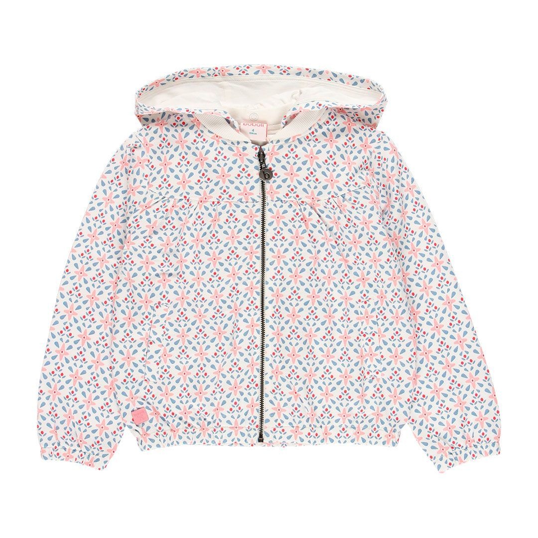 • White printed hooded jacket with zip closure.