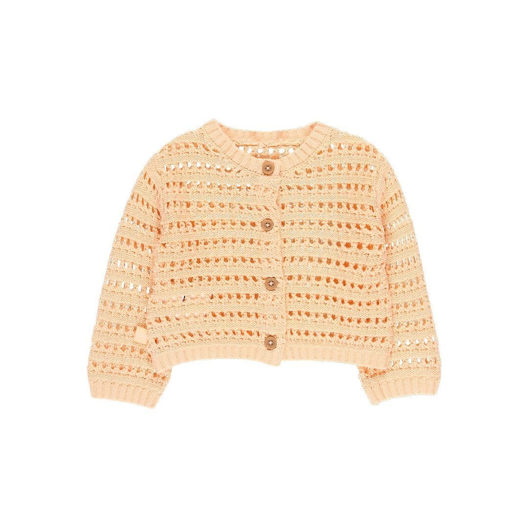 • Peach-colored knitted cardigan.